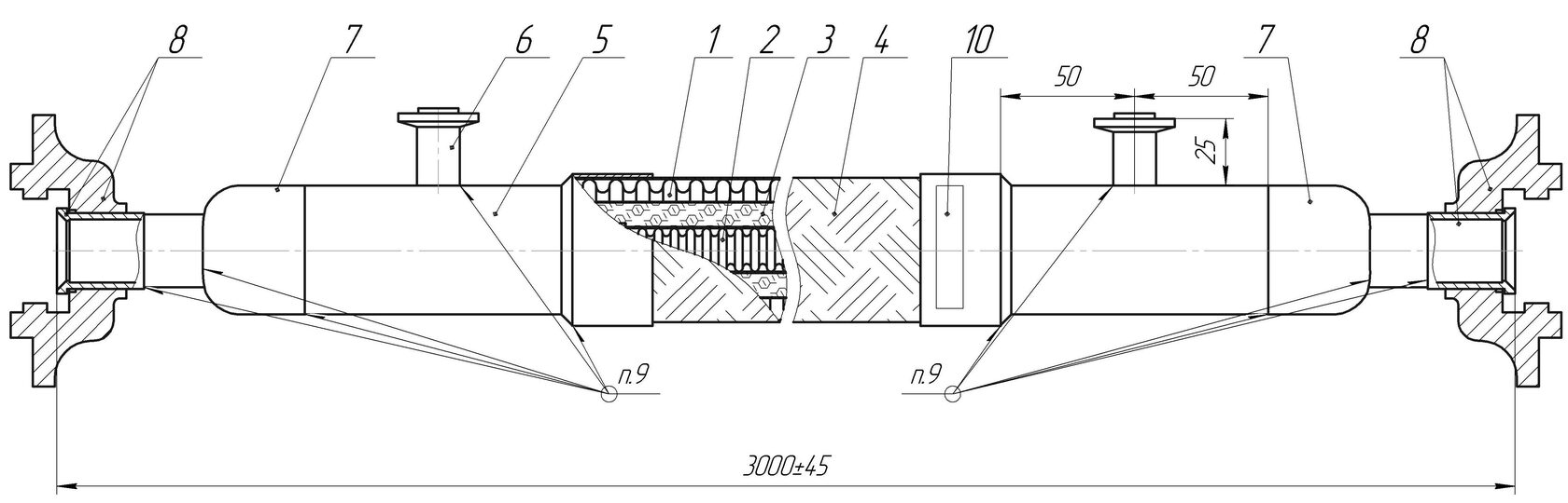1. Внутренний металлорукав для перекачки криогенных жидкостей 2. Наружный "рубашечный рукав" 3. Изоляционный слой 4. Вакуумная полость 5. Вакуумный порт